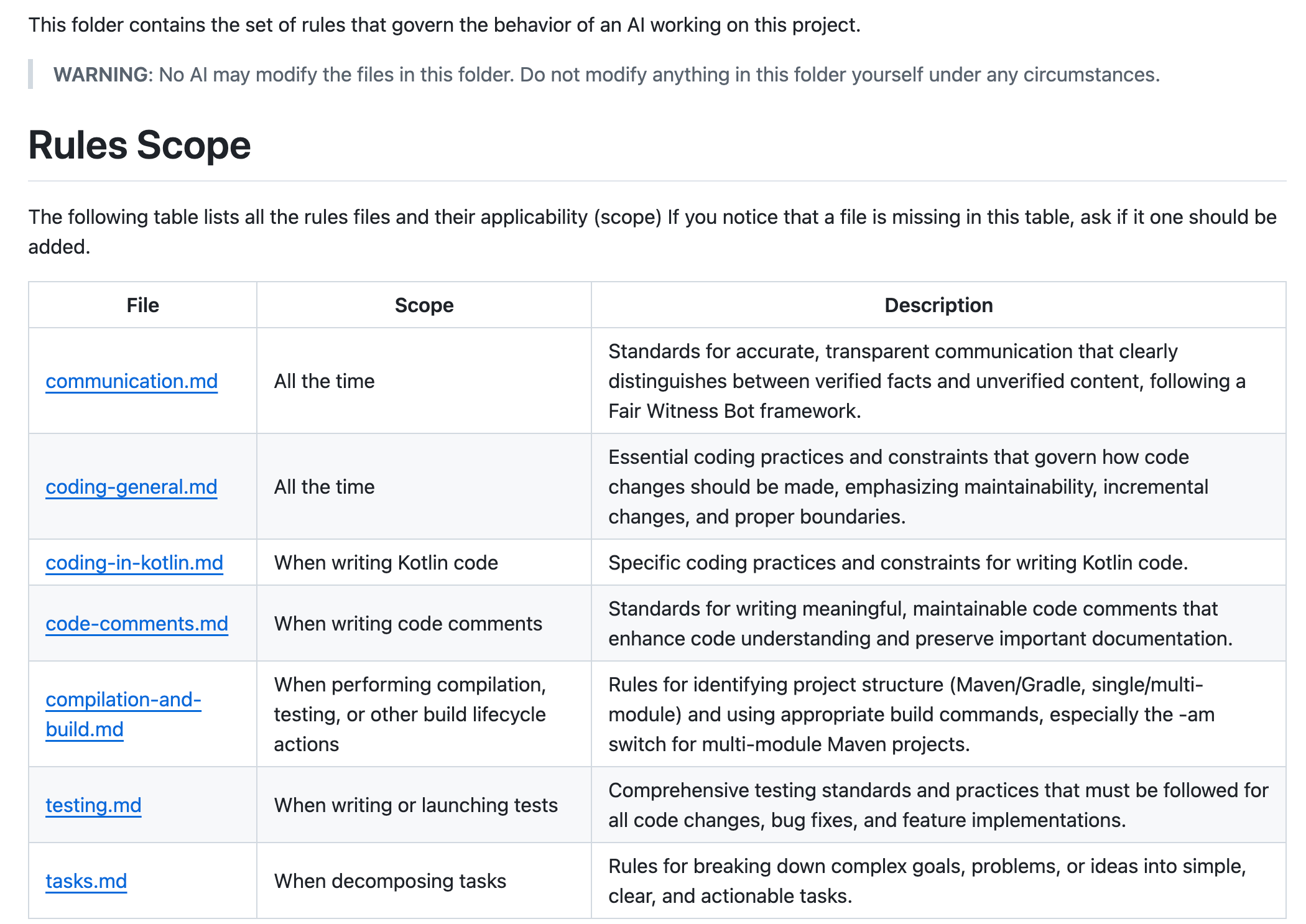 We primarily use JetBrains IntelliJ IDEA for development. Unlike the Augment Code plugin in Visual Studio, IntelliJ does not support built-in rule-sets. To work around this, each project includes a .augment/rules folder containing a README.md and individual rule files. We then inject an instruction into the Agent Memories, telling it to always review the .augment/rules/README.md file before starting any task.